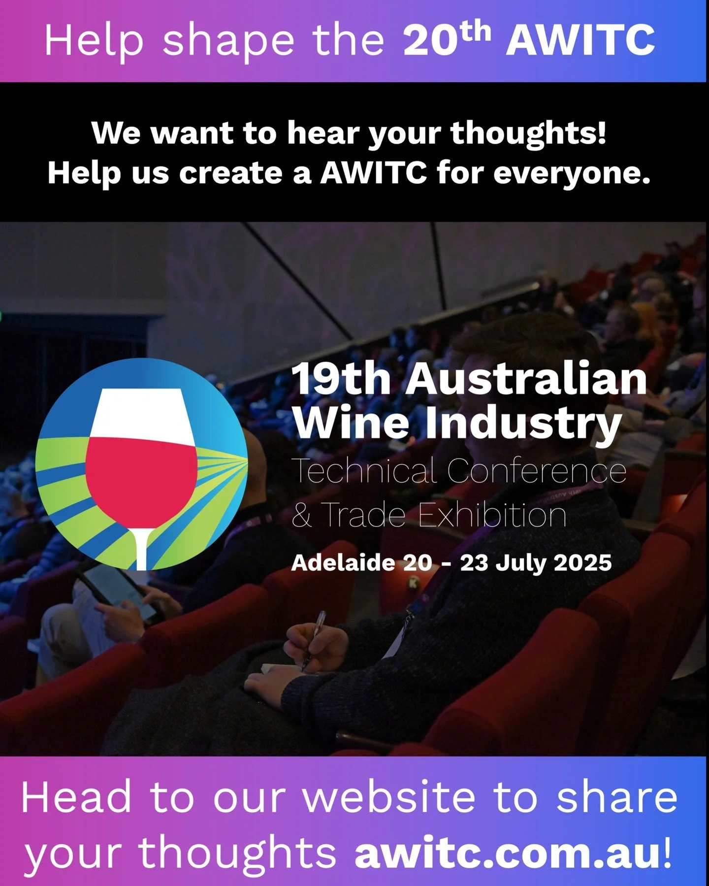 The 19th AWITC will be held in Adelaide 20-23 July 2025. This event will incorporate the Outlook Conference in partnership with Australian Grape & Wine and feature the WineTech trade exhibition in collaboration with the Wine Industry Suppliers Australia Inc. and Expertise Events.